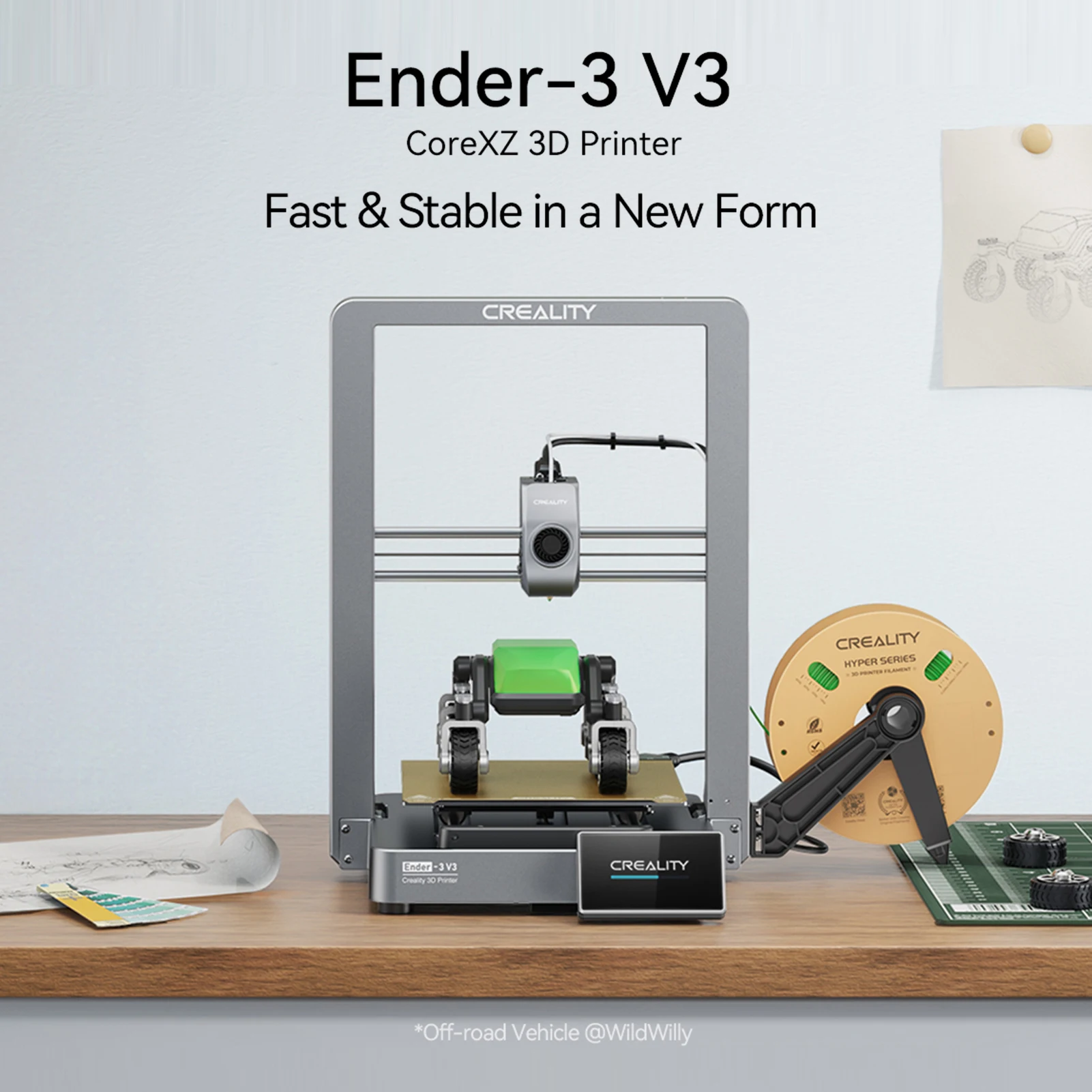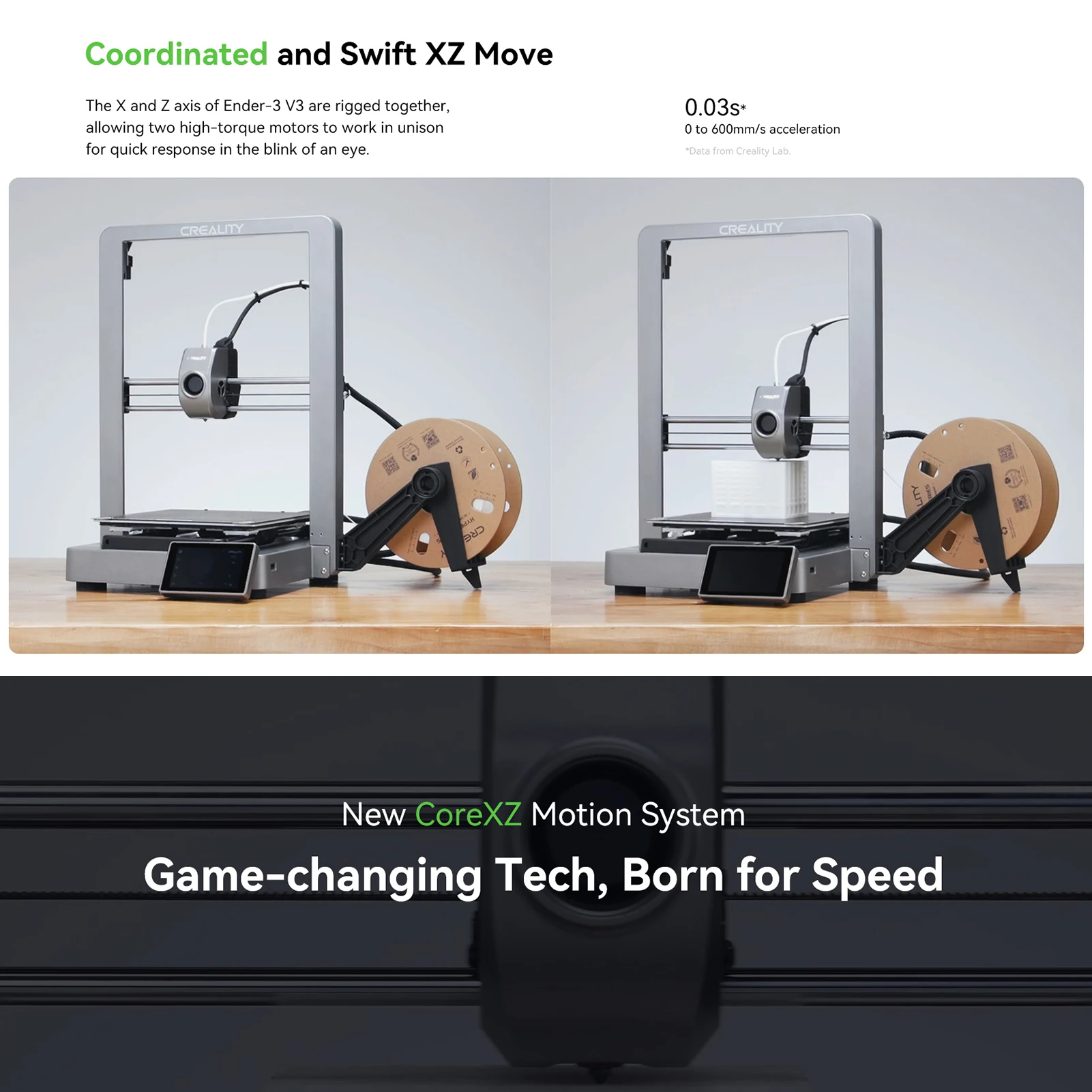 【CoreXZ for 600mm/s Fast Speed】 It can print 12 times faster than a regular i3-style 3D printer, a new benchmark for bed slingers. The motion system is much lighter and faster with the X and Z motors attached to the base. X and Z-axis are rigged together as one, allowing two high-torque motors to work in unison for quick response. And, Ender-3 V3 prints faster and better with Creality Hyper PLA filaments.