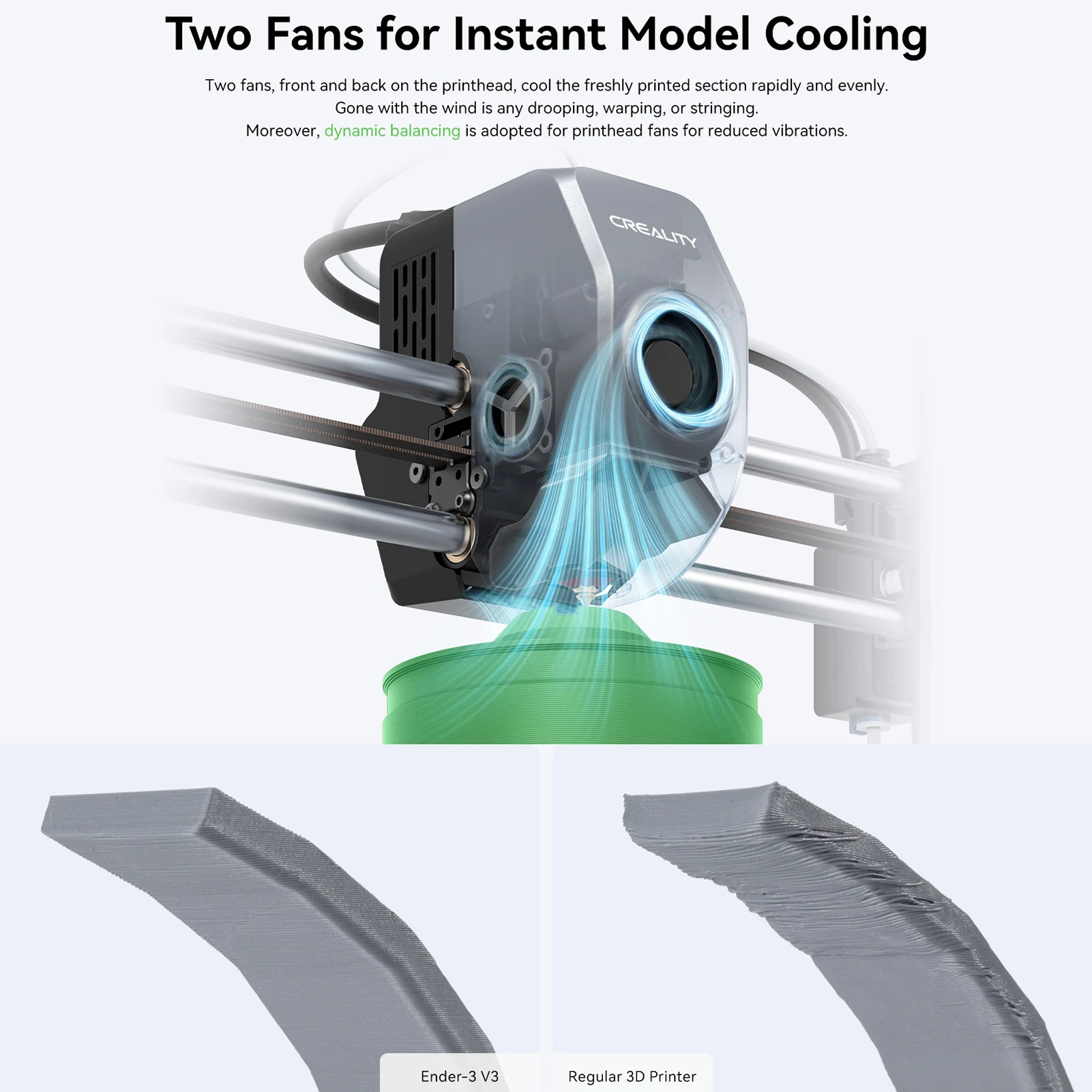 【Instant Model Cooling System】 Equipped with 2 cooling fans on the print head, their strong and even wind boosts cooling during printing for better printing quality. The front part cooling fan and the hotend cooling fan are dynamically balanced. So they are less likely to wobble, minimizing ringing or ghosting.