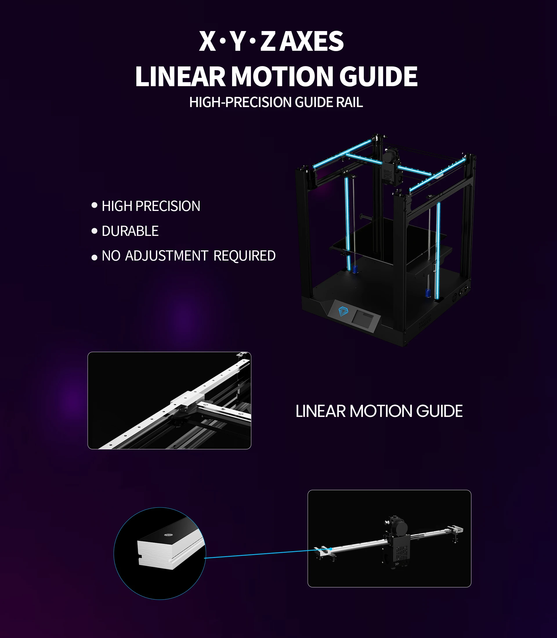 Linear guide rails on the double Z-axis improve printing accuracy and stability, reduce load, and extend service life.