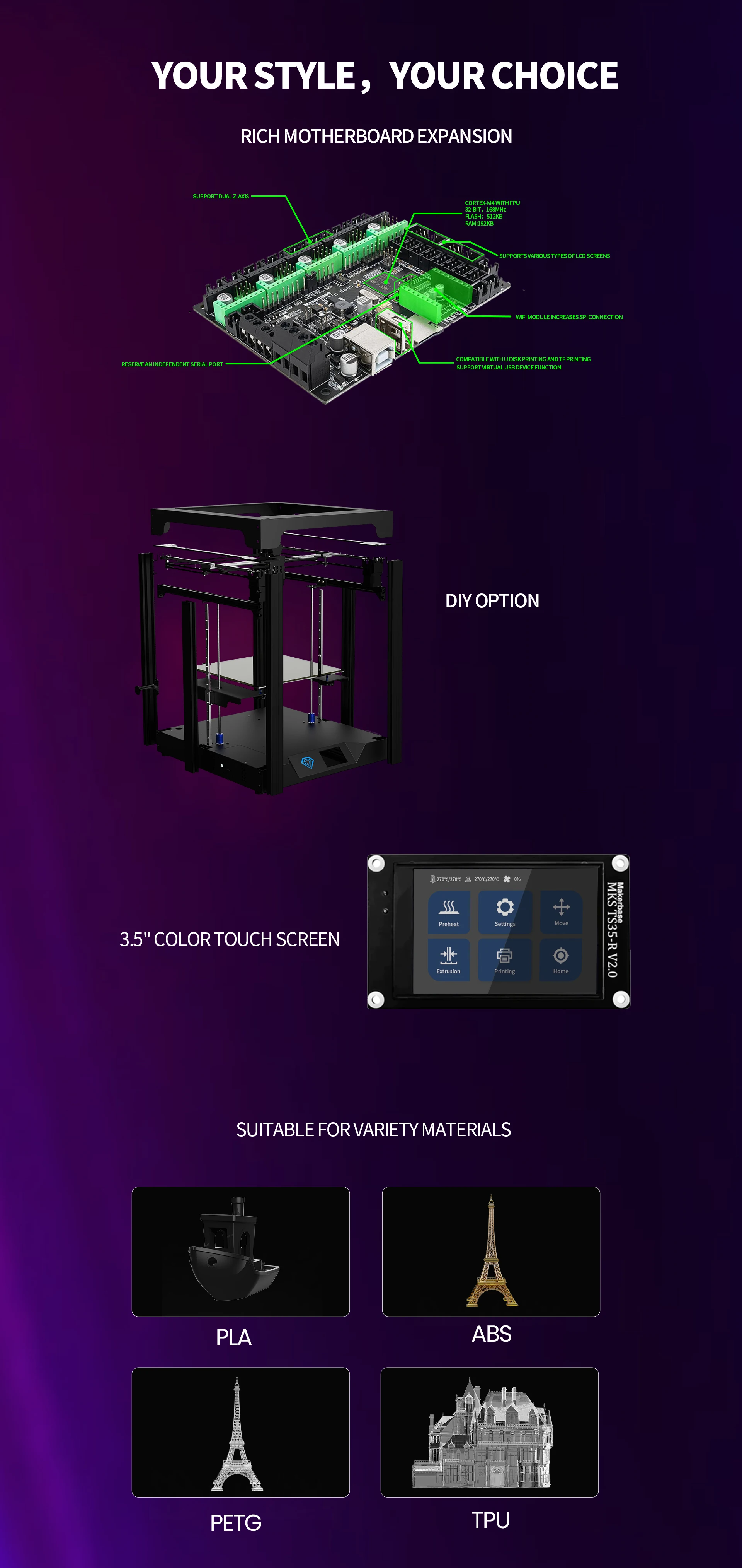 With a max printing area of 300*300*330mm, the printer enables printing models of different sizes.