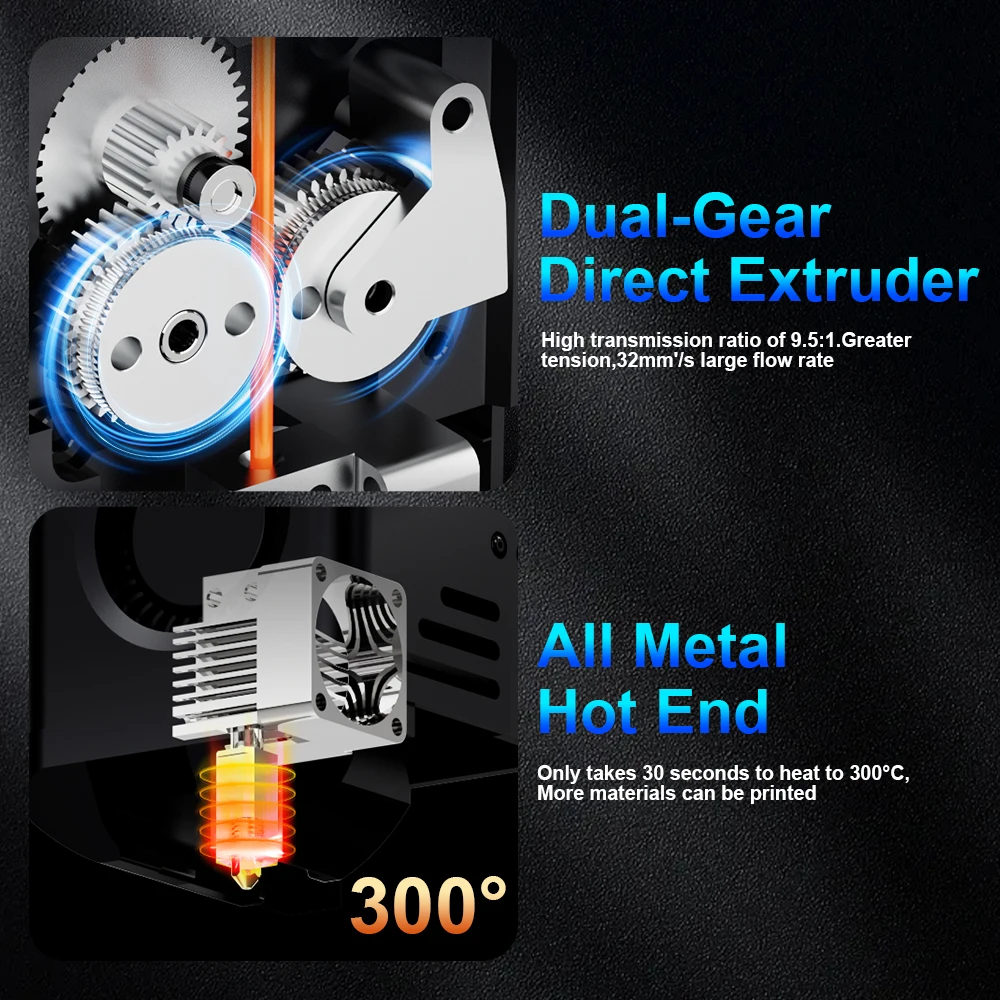 Features:Multi-axis, Heated Bed, dual extruder, Resume Printing, Filament Detection, auto leveling